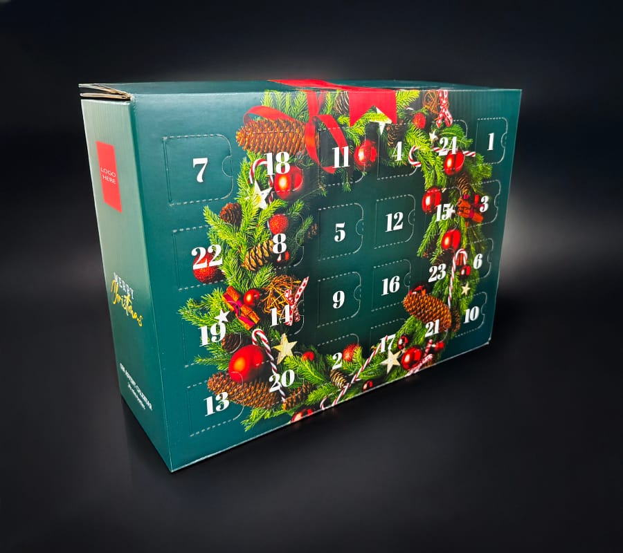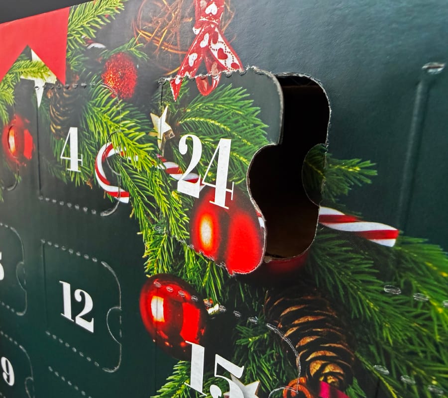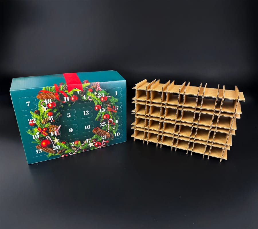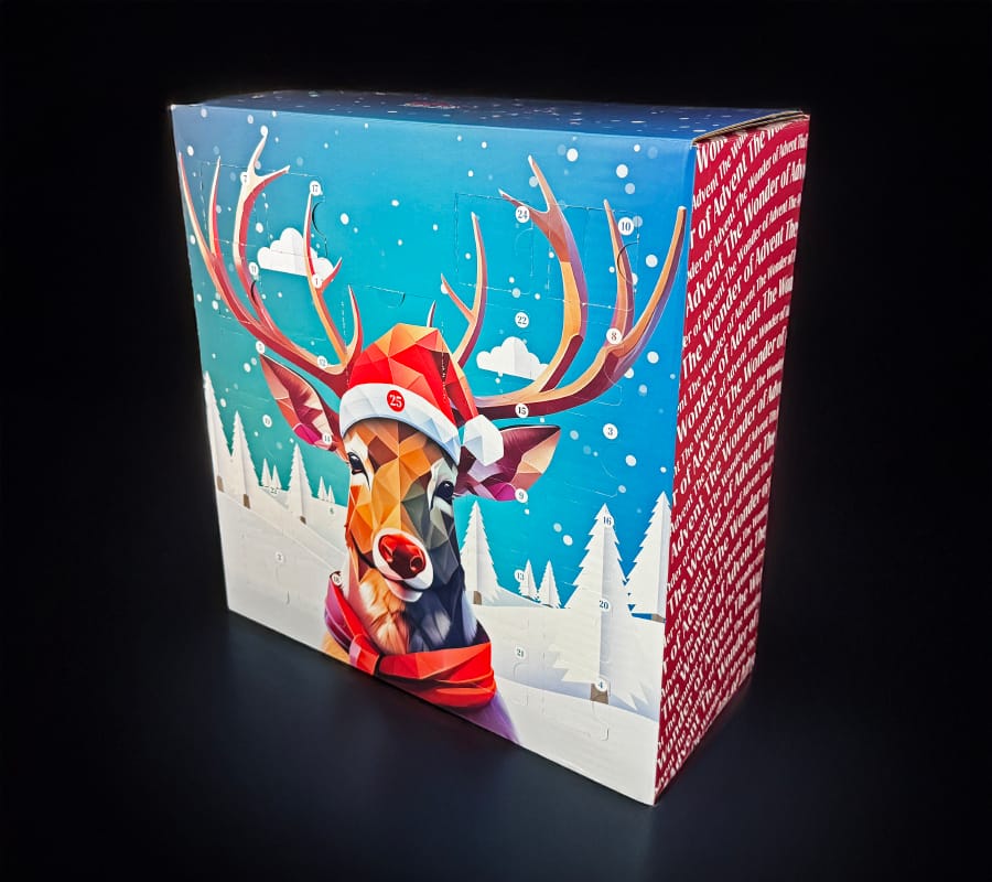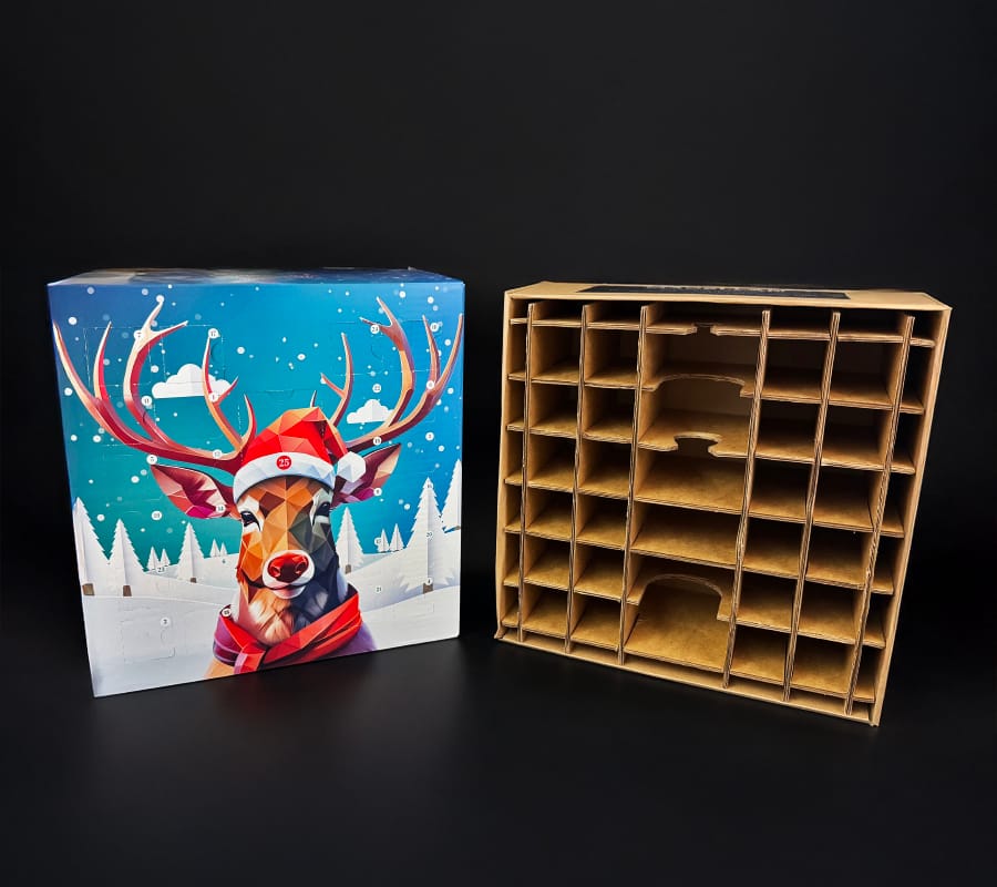 The Reindeer calendar concept was created with wines and larger-format bottles in mind, offering a strong structural solution for brands wishing to include full-sized or premium bottles within a festive calendar format. The internal layout allows for a larger featured bottle alongside the remaining compartments, creating a natural focal point within the design.