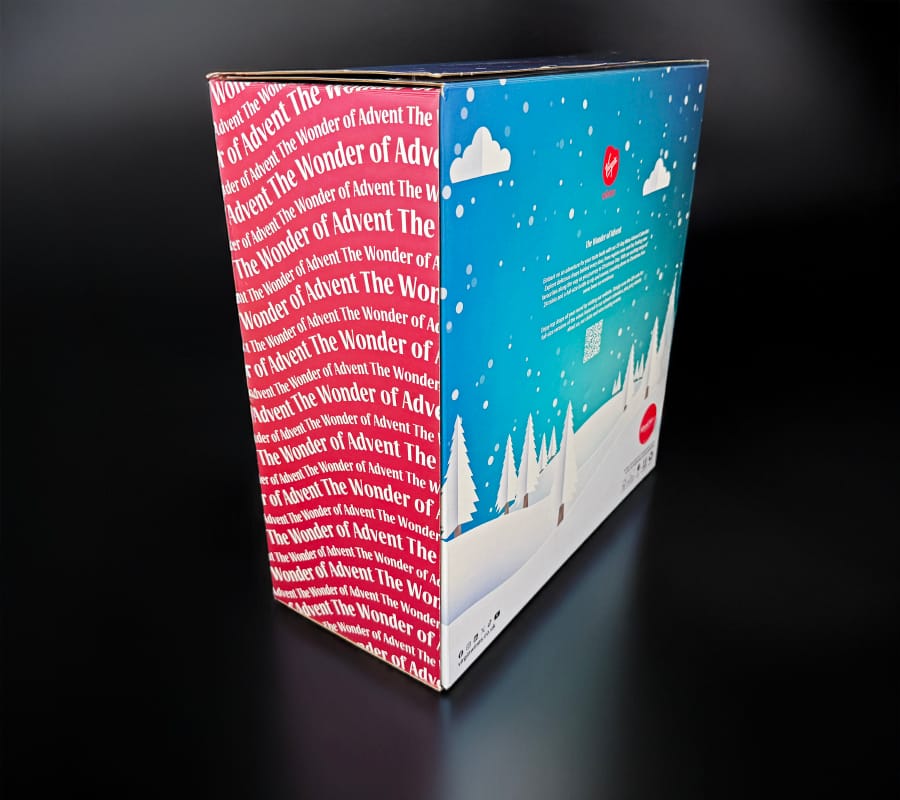 The external size of the calendar is 43cm in length, 20cm in width and 45cm in height. It is constructed using E-fluted board and includes perforated advent doors. Full CMYK printing allows for bold, high-impact artwork, shown here through a bright geometric design style and playful typography along the side panels. Within the artwork, a natural gap at the centre of the illustration demonstrates where a brand logo or message could be accommodated when producing a client version of the calendar, without redesigning the overall structure.