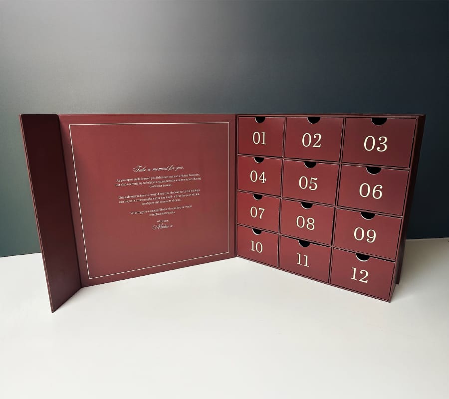 This page provides a rough price guide and specifications for a selection of advent calendars we’ve recently produced. The examples below are designed to give you a clear idea of the styles, formats, quantities, and delivery options available — and how these factors can influence pricing. Every advent calendar we create is made to order, meaning we can tailor the design, structure, and internal layout to suit your brand and the items you wish to include.